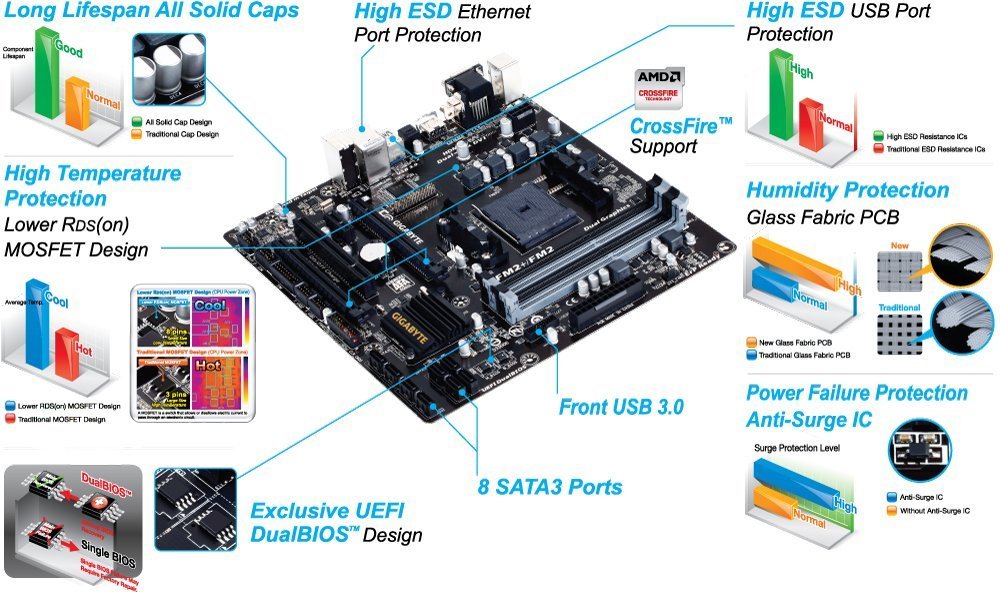 Socket FM2+ supports AMD FM2+/FM2 A-series APU. GIGABYTE Ultra Durable 4 Plus Technology. GIGABYTE UEFI Dual BIOS. 2-way CrossFire Support. GIGABYTE On/Off Charge for USB devices. 4 USB 3.0 ports with GIGABYTE 3x USB power. HDMI, Dual-link DVI, D-sub ports for Triple-Monitor support. High ESD Protection on GbE LAN and USB ports. All solid capacitors design.